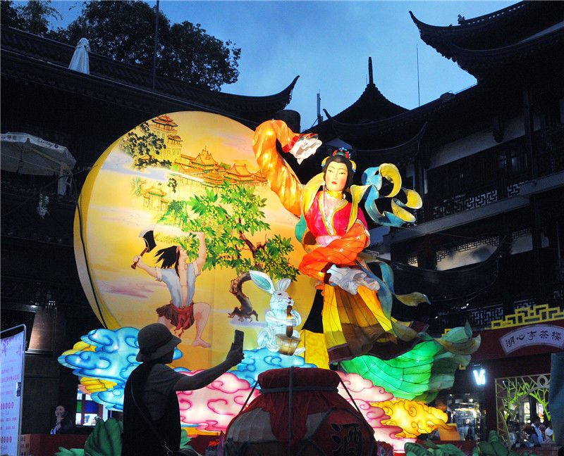 2017年9月7日,上海,夜幕下,豫园中心广场的大型“嫦娥奔月”的中秋灯彩景观首次亮灯,吸引众多的游客纷纷拍摄留影。