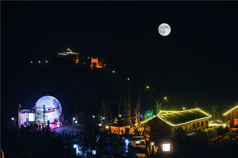 2016年9月15日,河南洛阳,中秋当晚天气晴好,一轮明月当空,扮靓了城市美景。在洛阳近郊的万安山上,在山顶露营的人们相聚举行庆祝活动,共同赏月,地面上一轮人造10米高的月亮与天上明月相互辉映,为中秋佳节增添了诗意氛围。两重曝光。