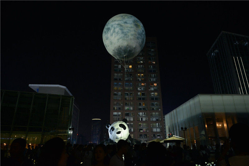 2016年9月15日,在成都市闹市春熙路一商城楼顶,商家为吸引眼球,将一支巨型的充气式“月亮”挂在半空中,以假乱真,让市民观看中秋夜的“明月”。