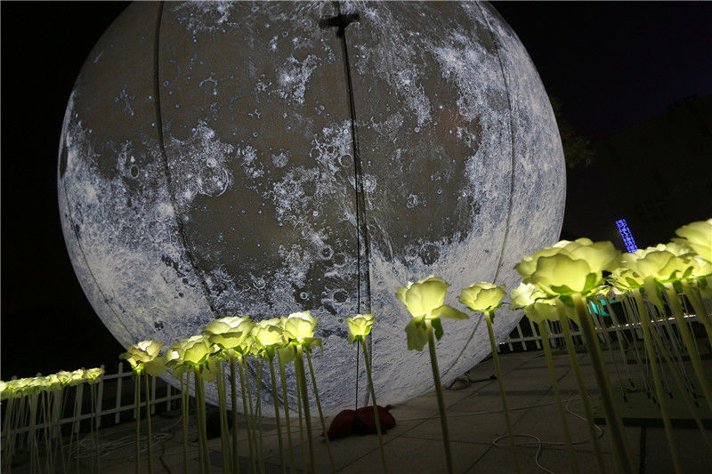 2016年9月13日,山东省滨州市,一楼盘售楼中心前立起一个巨大的人造月亮,为即将到来的中秋节楼盘促销活动造势。作为房地产行业来说,金九银十是一年里最重要的销售时段,各个楼盘都卯足了劲准备大招吸引客户。
