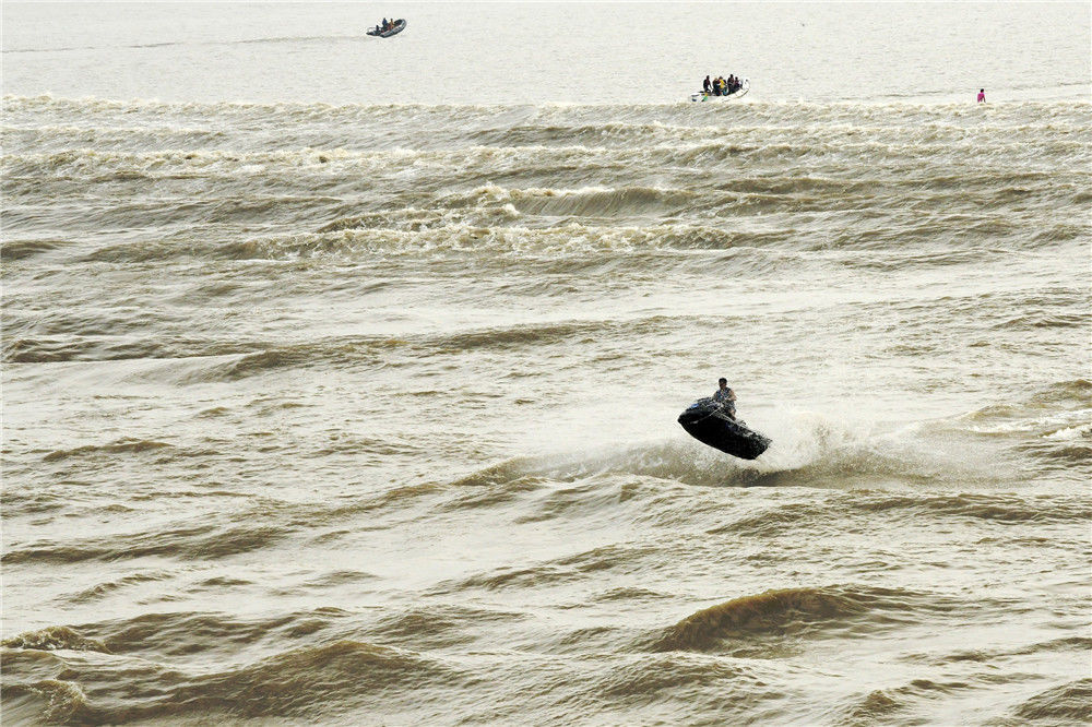 杭州:钱塘江迎来大潮汛 冲浪高手江上弄潮