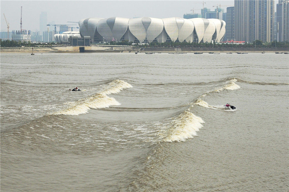 杭州:钱塘江迎来大潮汛 冲浪高手江上弄潮