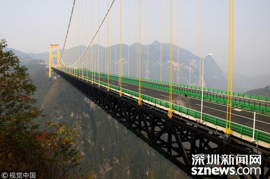 【世界第一高悬索桥——四渡河大桥】四渡河特大桥位于巴东县野三关镇四渡河,大桥主跨900米,桥面与峡谷谷底高差达560米,相当于200层楼高,是目前国内在深山峡谷里修建的最大跨度悬索桥,比目前世界最高桥法国米约大桥还要高290米,被誉为世界第一高悬索桥。