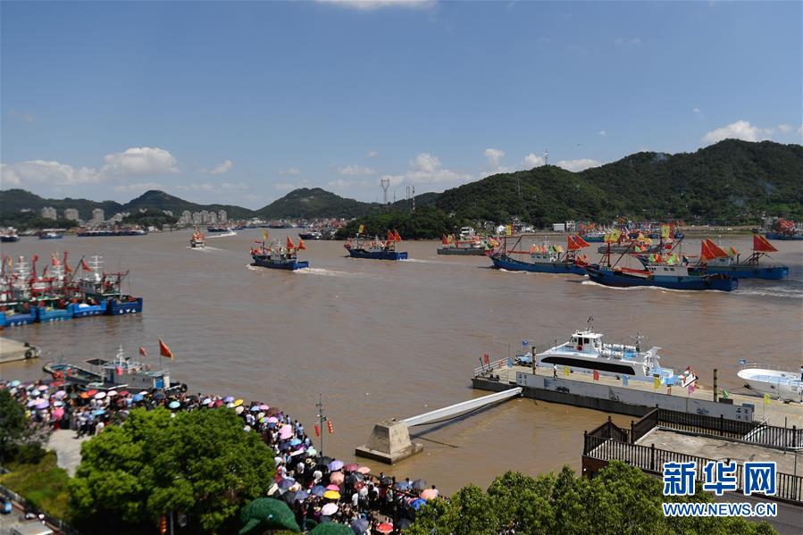 9月16日,渔船列队从全国六大中心渔港之一的浙江宁波象山石浦渔港驶出入海,不少观众在岸边欢送。 新华社记者 黄宗治 摄