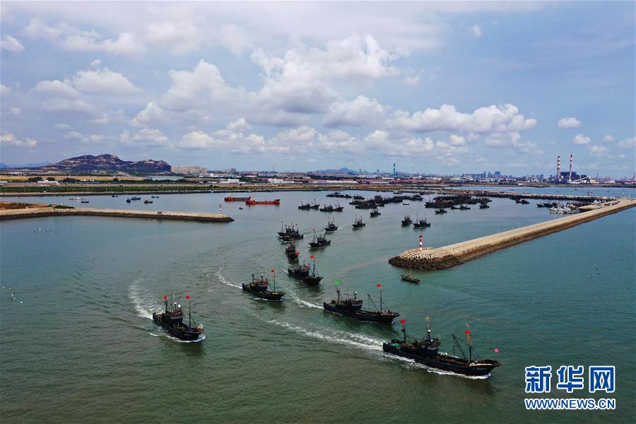 9月1日,渔船从日照黄海中心渔港出海捕鱼(无人机拍摄)。新华社记者 王凯 摄