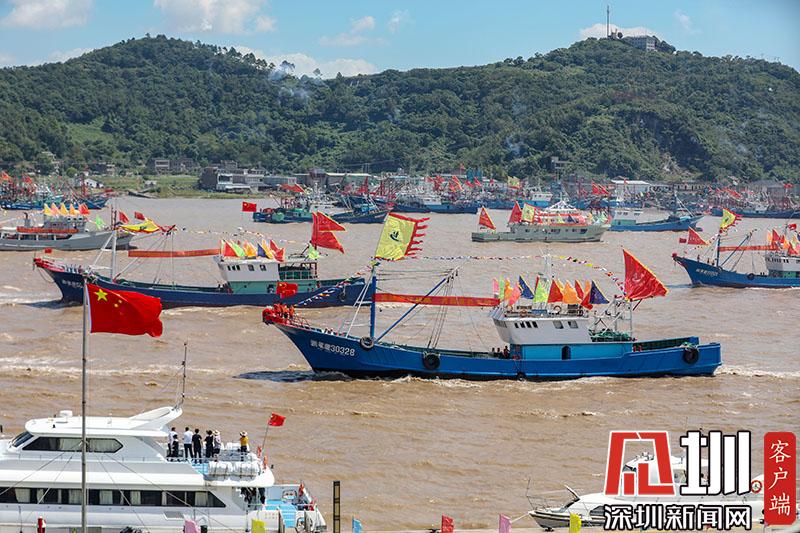 9月16日,渔船首尾相接,宛如一支威风八面的庞大舰艇编队。