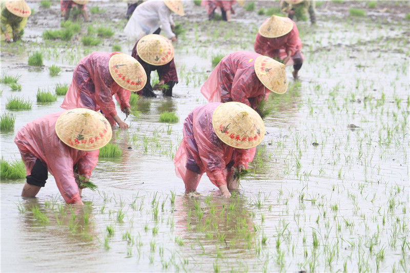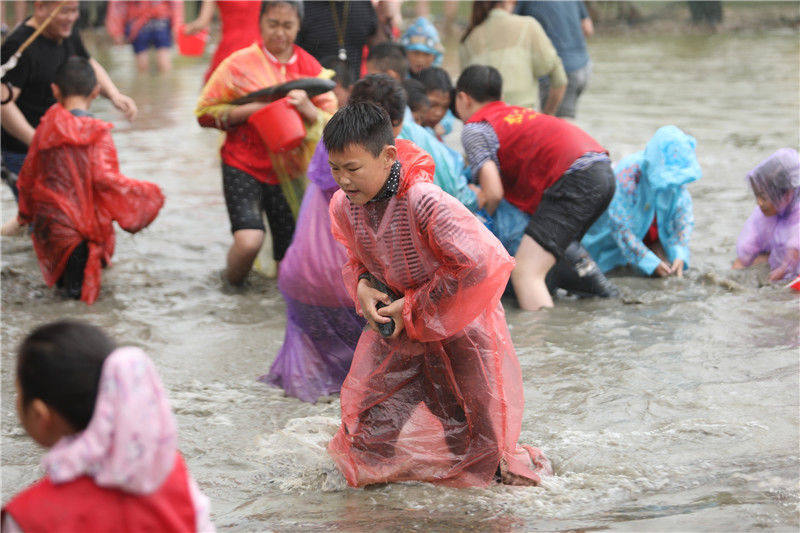 2019年5月26日,江苏淮安市洪泽区岔河镇举办“插秧节”活动,游客通过手工插秧比赛、亲子插秧体验、稻田抓鱼、稻田拔河等趣味游戏体验农耕乐趣,感受田园生活。陈凯/视觉中国 编辑/陈进