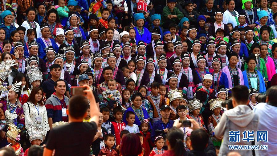 10月28日,在广西融水苗族自治县拱洞乡龙令村,游客和各族群众合影。新华社记者 黄孝邦 摄