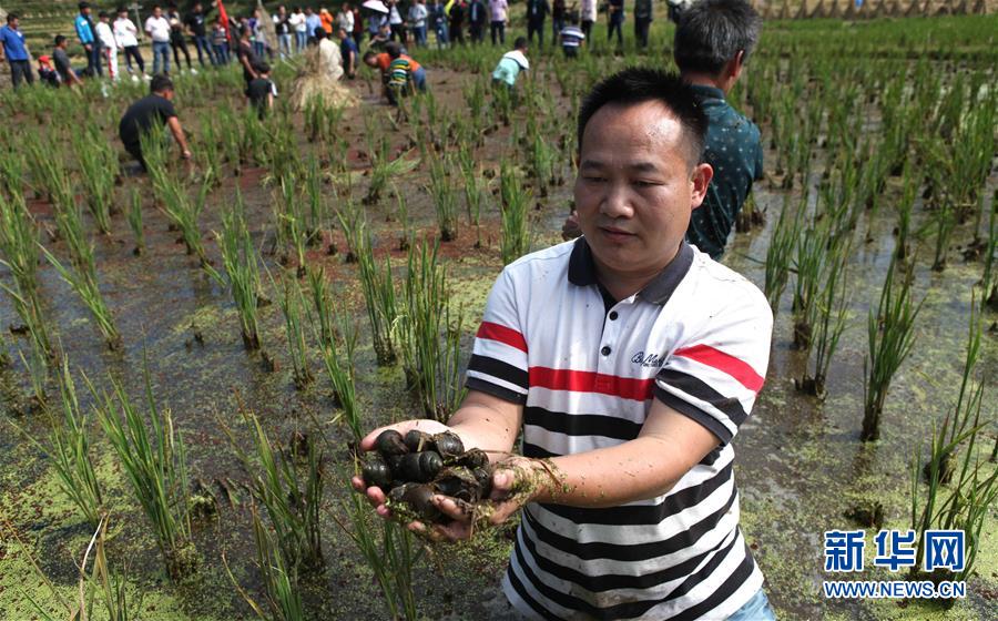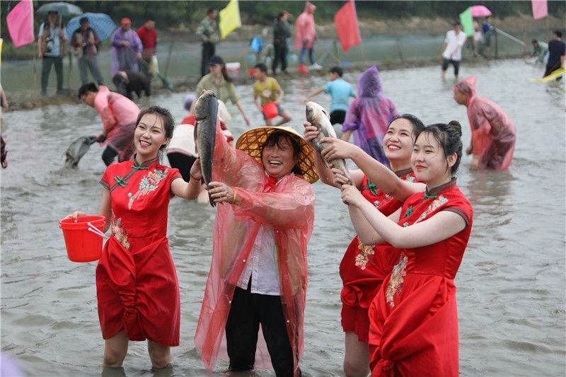 10月28日,在广西融水苗族自治县拱洞乡龙令村,村民参加抓鱼比赛。当日,广西融水苗族自治县拱洞乡举办香糯泉水螺美食文化节,苗族、侗族、瑶族、壮族等各民族同胞欢聚一堂,通过摸螺抓鱼比赛、田螺姑娘评选、跳芦笙踩堂舞、品香螺百家宴等丰富多彩的活动,庆祝金秋丰收。近年来,拱洞乡依托生态资源优势,大力发展香糯种植、田螺养殖等特色产业。全乡的田螺养殖面积4000多亩,成立4家田螺产业专业合作社,带动2000多农户参与到田螺养殖。目前,田螺养殖已成为当地贫困户脱贫致富的重要产业。新华社记者 黄孝邦 摄