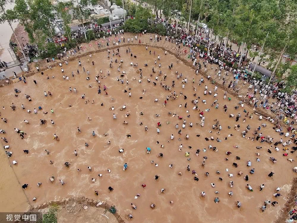 苗族群众在活动场地内争抢活鱼,抢的鱼越多,寓意福气就越多。