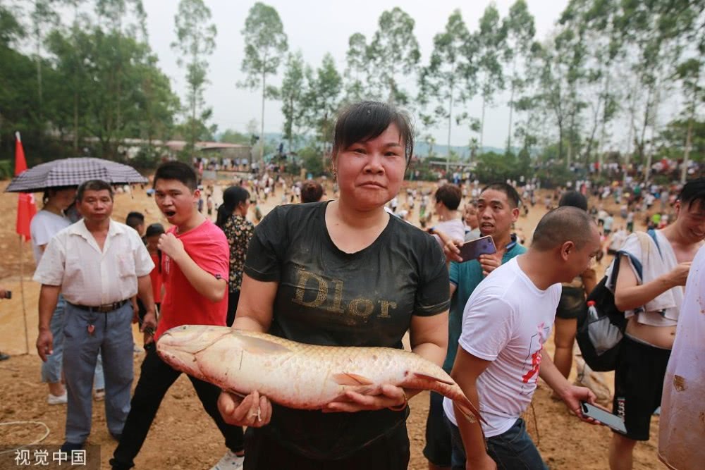 一名村民在广西柳州市融安县安宁村大袍屯“闹鱼”活动中展示抓到的活鱼。
