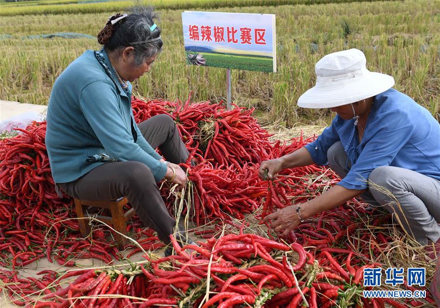 9月15日,云南寻甸回族彝族自治县七星镇鲁古村的农妇在参与编辣椒比赛。 新华社记者 杨宗友 摄