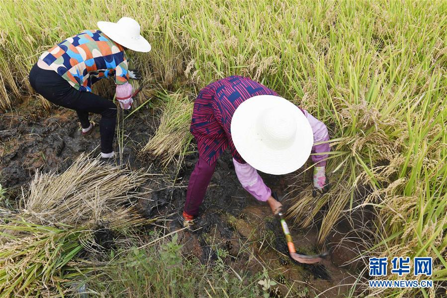 9月15日,云南寻甸回族彝族自治县七星镇鲁古村的农妇在参加割稻谷比赛。 新华社记者 杨宗友 摄
