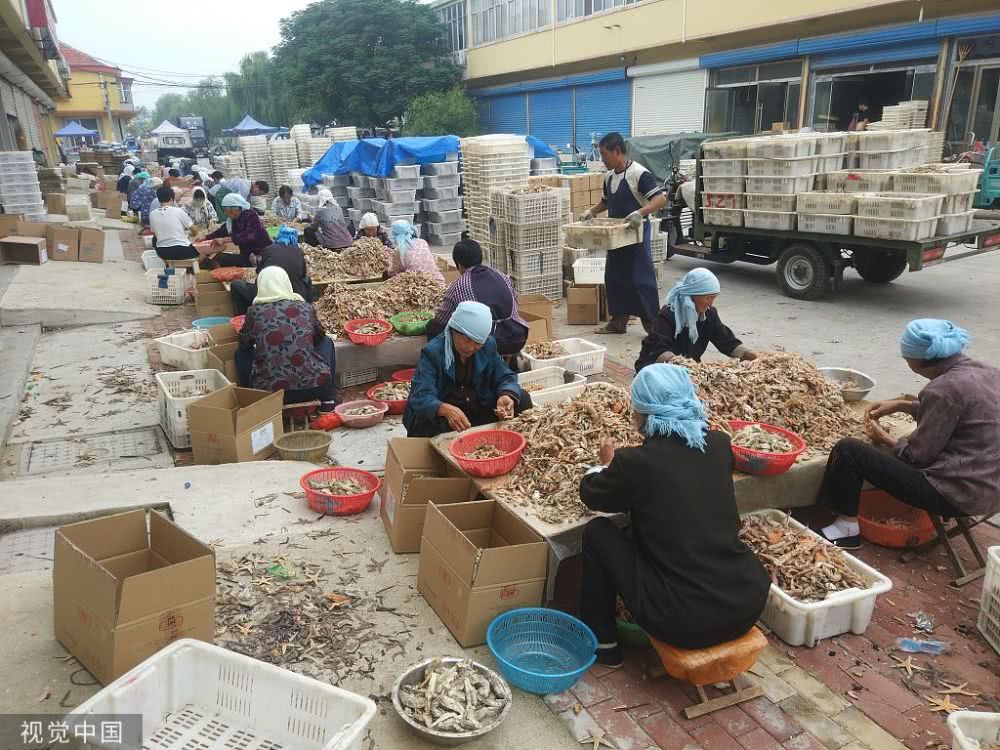 渤海湾畔海产丰收,成群鱼虾分拣后当街晾晒,场面赛晒粮食
