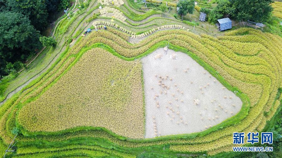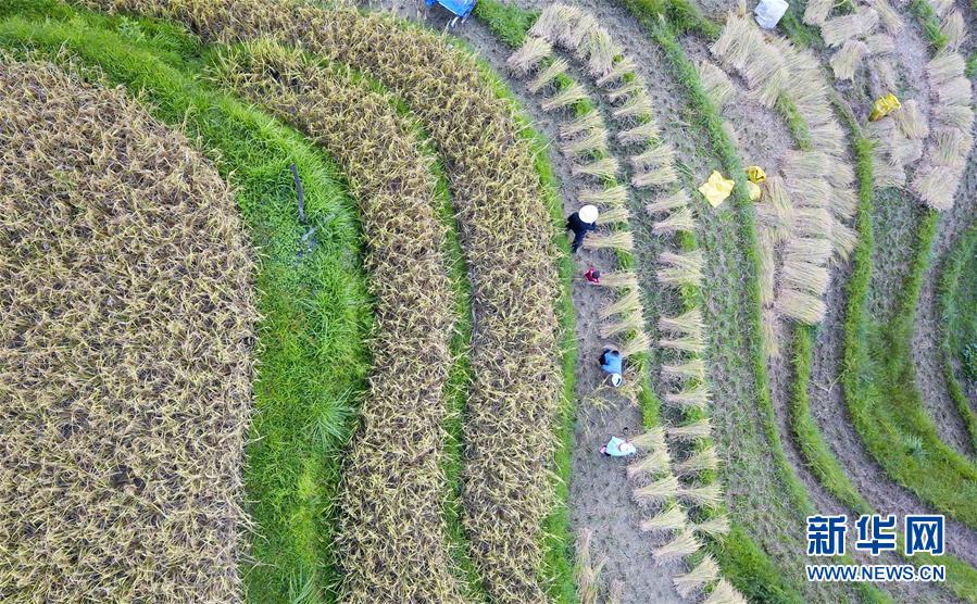 9月17日,贵州省榕江县计划乡计划村阳开苗寨的村民在收割稻谷(无人机拍摄)。新华社记者 杨文斌 摄