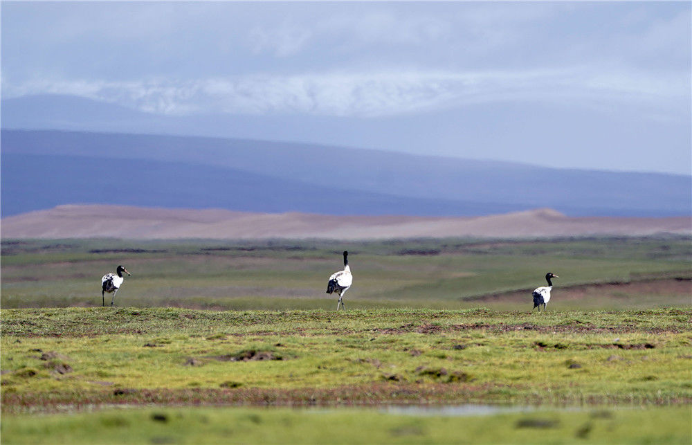 2017年8月26日,青海,三只国家一级保护动物黑颈鹤一起出现在画面中。陈伟斌/南方都市报/视觉中国