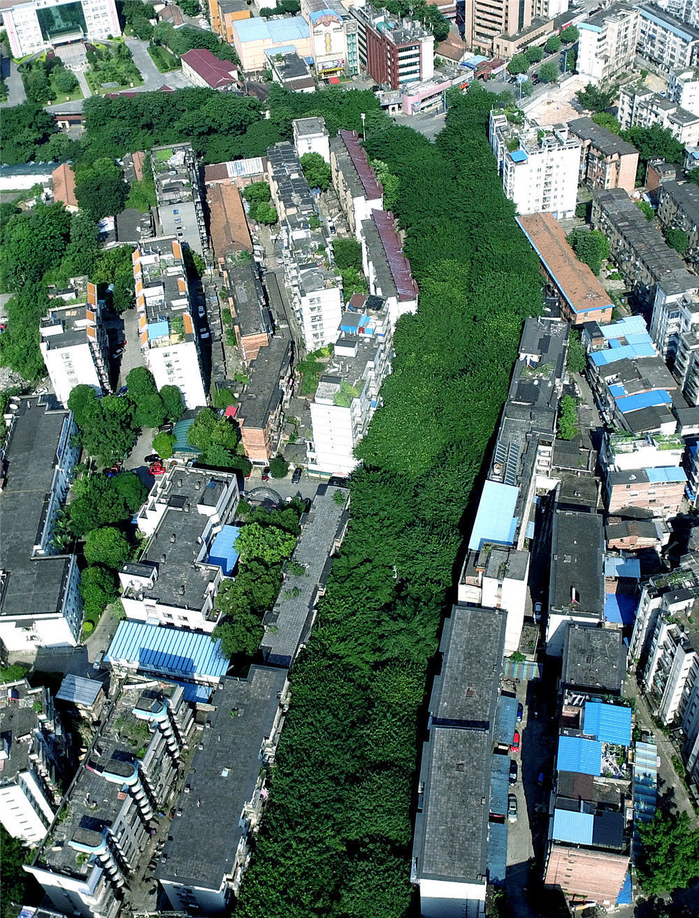 2016年6月22日,广西柳州,市三中路西段和北段,参天大树遮住了整条道路。跟随无人机的视角,从200米上空俯瞰,整条道路一片葱绿,仿佛在大地上流淌的一帘“绿色瀑布”。航拍镜头下的广西柳州市三中路被绿植完全覆盖,仿佛一条流淌着的“绿色瀑布”。黎寒池/视觉中国