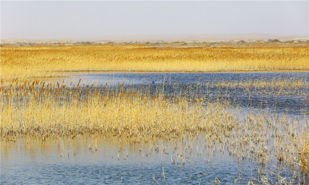 2015年4月2日,甘肃武威,野鸭在青土湖中游荡。经过多年治理,干涸半个世纪的民勤青土湖恢复碧波荡漾,水域面积达到22平方公里,天鹅、野鸭等十多种鸟类重新回到青土湖。曹志政/视觉中国