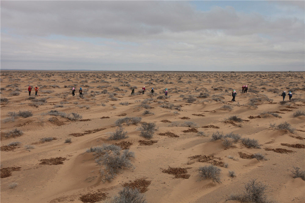 2015年4月2日,甘肃武威,腾格里沙漠甘肃与内蒙古交界处,来自甘肃民勤县红沙梁乡三角城村农民在沙漠中补栽沙生植物梭梭,这些农民从家到治沙现场需要70公里,每天早晨天不亮就出发,天黑后再回家,栽植一天梭梭有100元的收入。曹志政/视觉中国