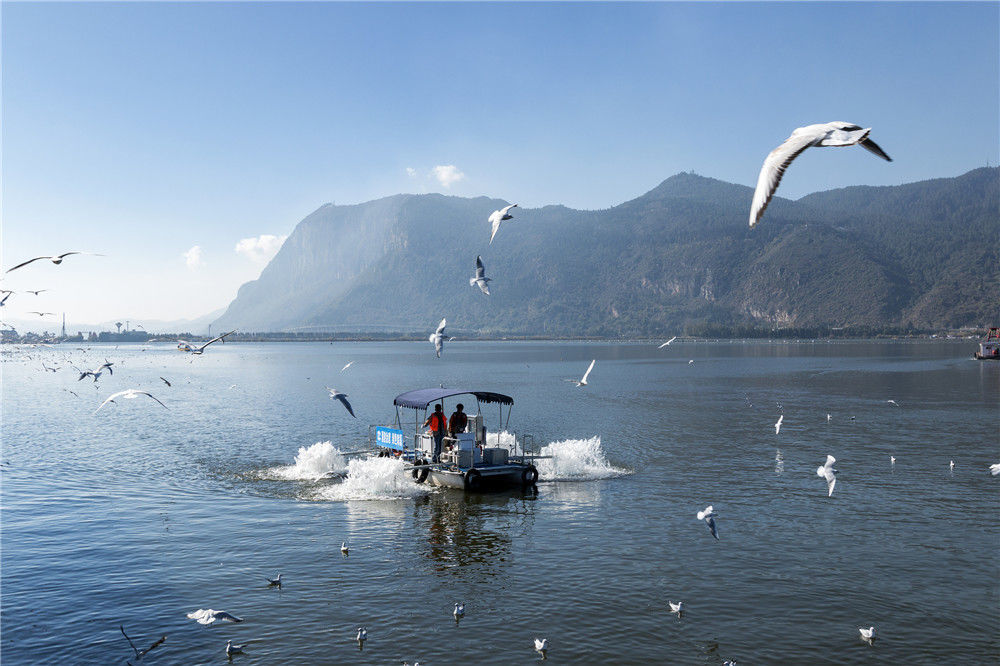 2018年12月23日,云南昆明滇池除藻船正在水面运行,治理滇池,海鸥在天空翱翔。万瑞/视觉中国