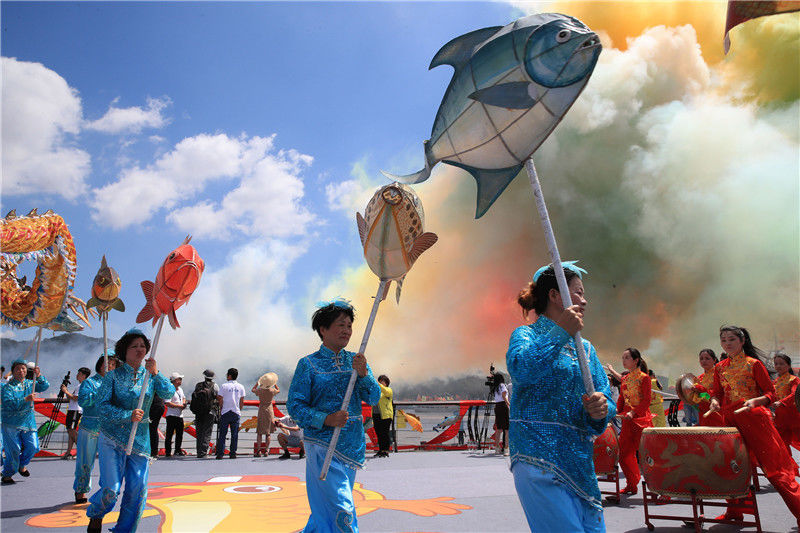 8月16日,演员在开渔节上表演舞狮。 新华社记者 周自扬 摄