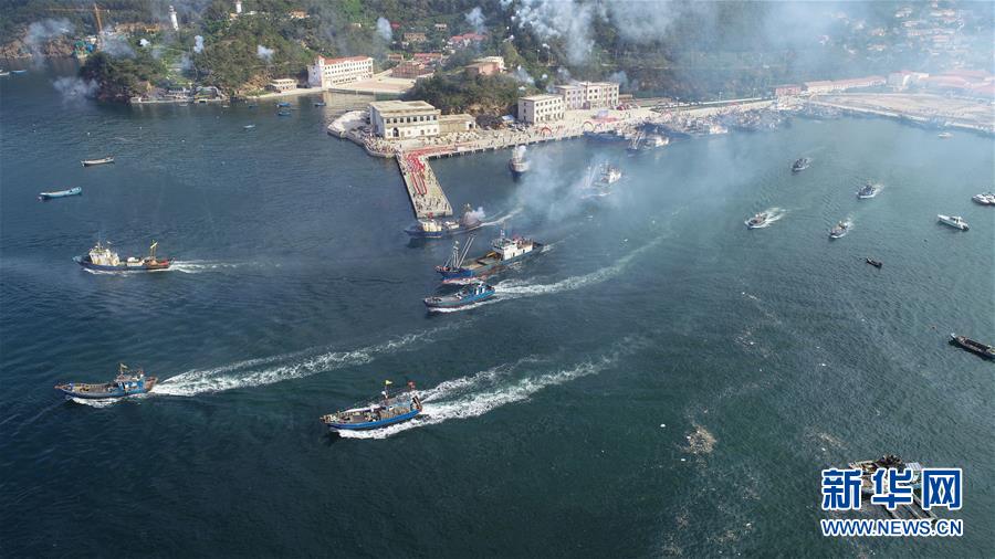 9月16日,渔船列队从全国六大中心渔港之一的浙江宁波象山石浦渔港驶出入海,不少观众在岸边欢送。 新华社记者 黄宗治 摄