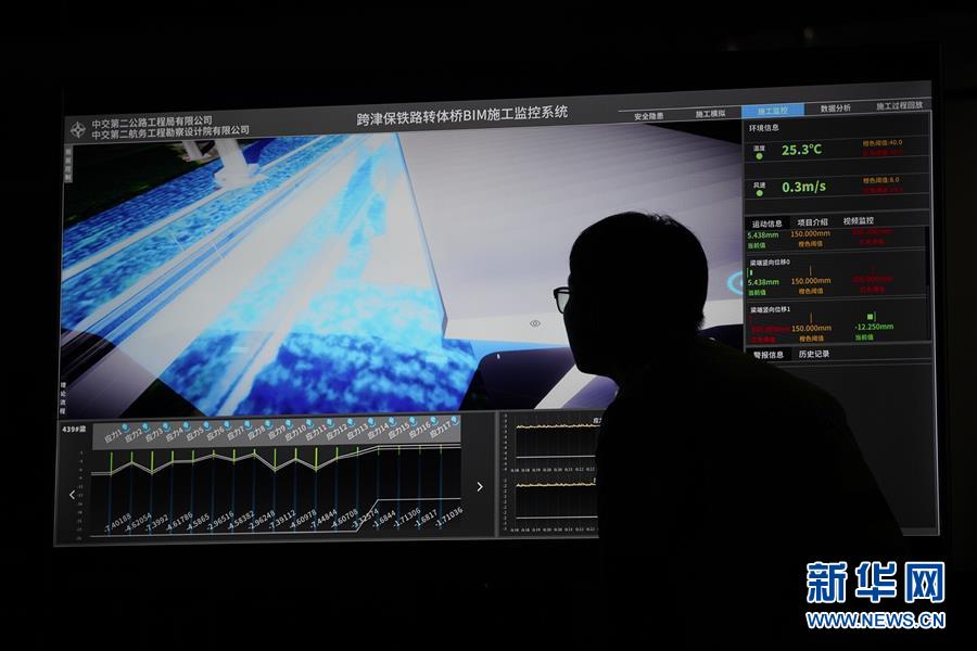 8月27日凌晨,施工人员在监控桥梁转体施工。新华社记者杨世尧摄