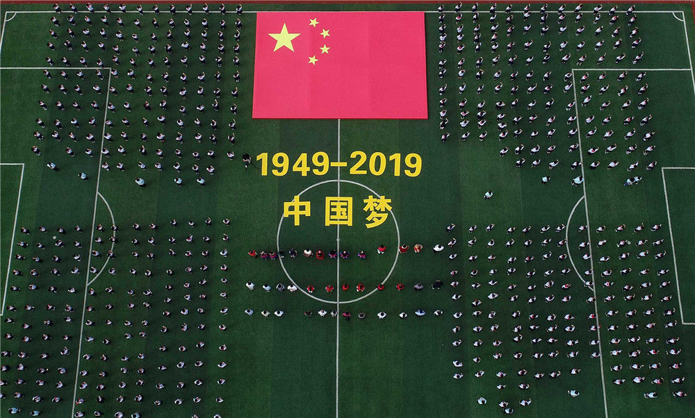 2019年9月9日,在湖南省衡阳市南华大学雨母校区运动场,同学们在2019级新生开学典礼上摆出“庆祝新中国成立70周年”的字样与国旗合影。曹正平/视觉中国