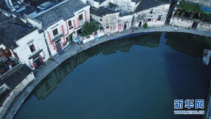 这是8月4日无人机拍摄的安徽黟县宏村风景区月沼晨景。新华社记者张端摄