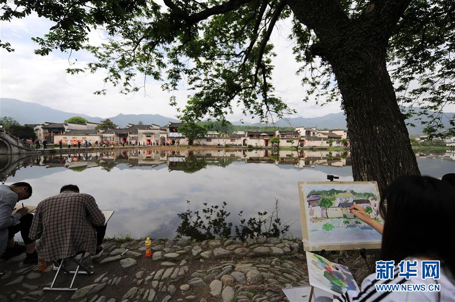 4月24日,绘画爱好者在宏村风景区写生。新华社记者任鹏飞摄