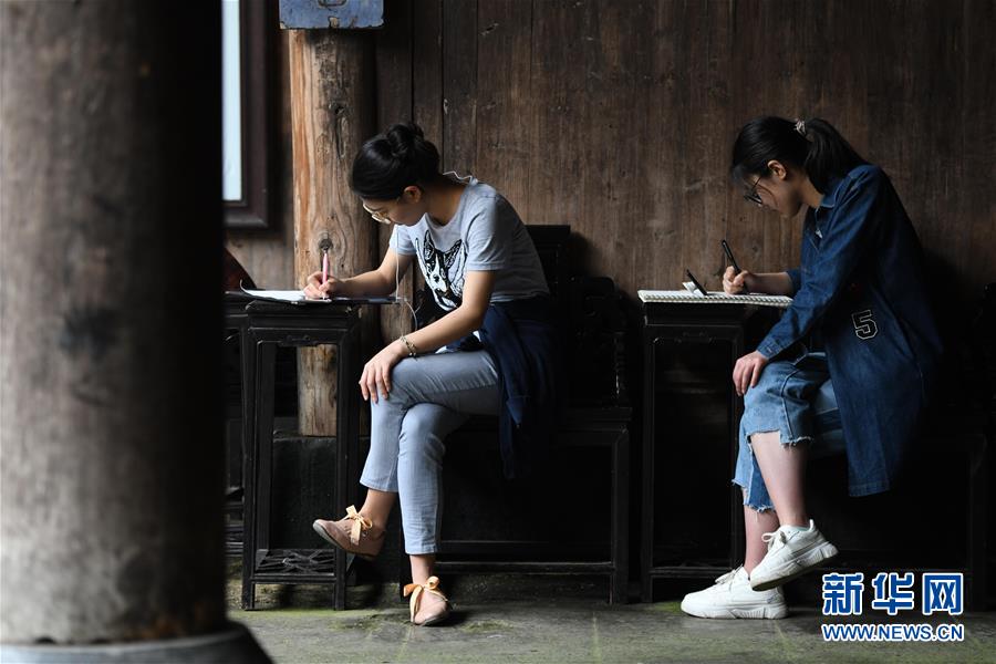 4月24日,绘画爱好者在西递风景区写生。新华社记者张端摄
