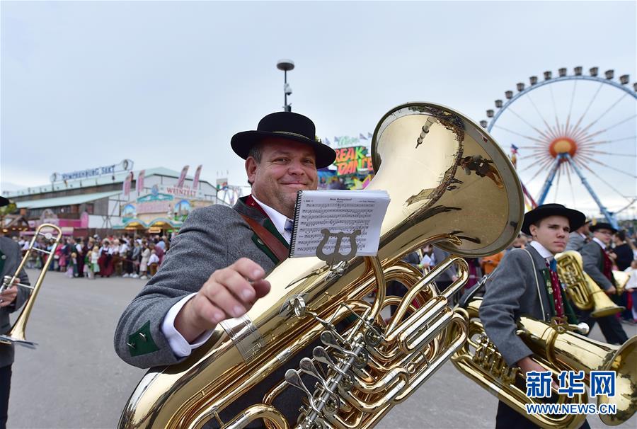 9月22日,在德国慕尼黑,一名乐手参加盛装游行。 新华社记者逯阳摄