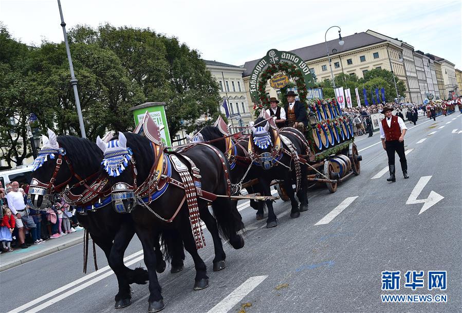 9月22日,在德国慕尼黑,人们乘马车参加盛装游行。 新华社记者逯阳摄