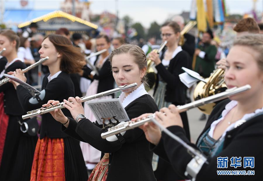 9月22日,在德国慕尼黑,乐手参加盛装游行。 新华社记者逯阳摄