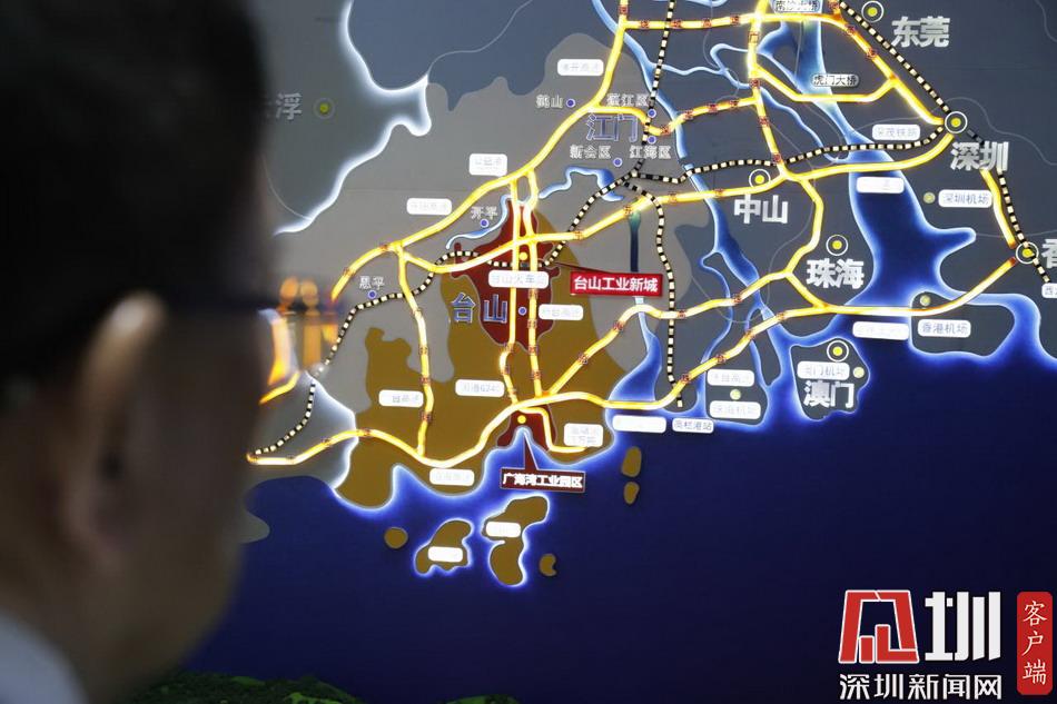 台山工业新城展示板前,一位联盟成员正在聆听讲解。