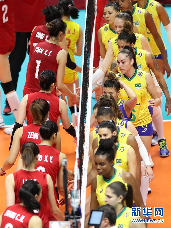 9月22日,中国队球员(左)在比赛后与巴西队球员握手致意。当日,在日本札幌举行的2019年女排世界杯赛第二阶段A组循环赛比赛中,中国队以3比2战胜巴西队。新华社记者杜潇逸摄