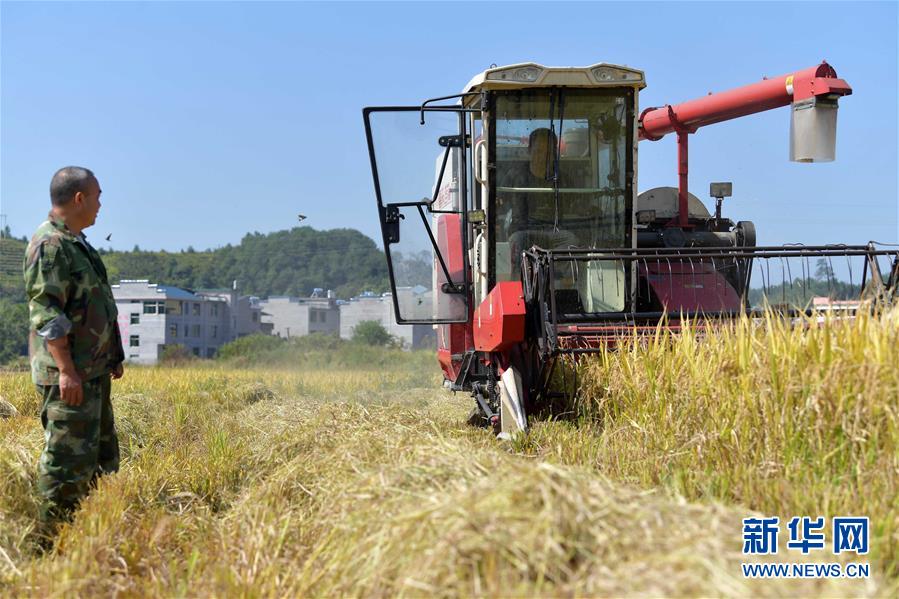 9月23日,在江西省井冈山市坳里乡,井冈山市高山红米种植专业合作社的社长文龙才(左)和社员在稻田里收割成熟的红米稻谷。