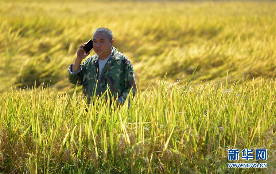 9月23日,在江西省井冈山市坳里乡,文龙才在稻田里接到联系购买井冈红米的电话。 新华社记者 彭昭之 摄