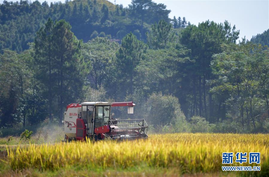 9月23日,在江西省井冈山市坳里乡,井冈山市高山红米种植专业合作社的社员在地里收割红米稻谷。新华社记者 彭昭之 摄