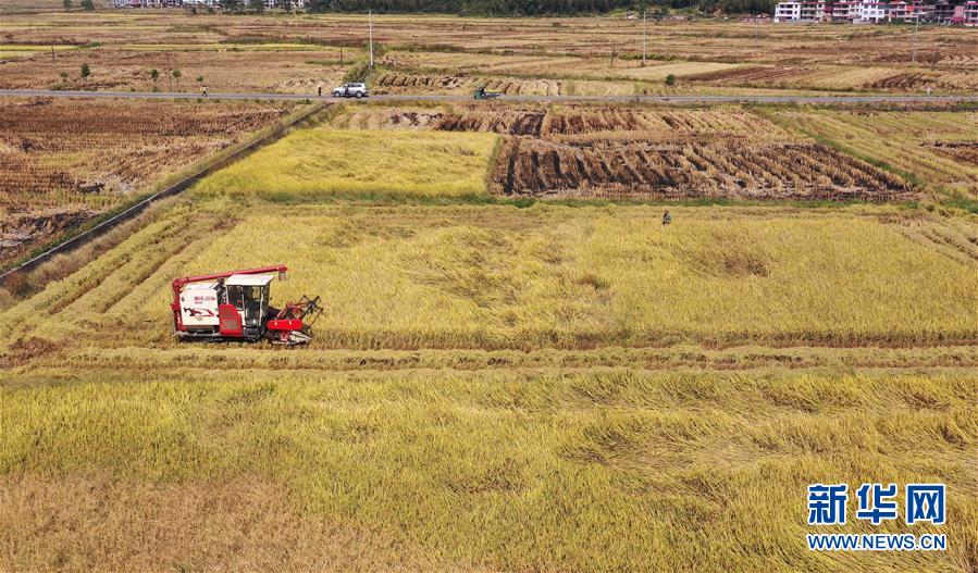 9月23日,在江西省井冈山市坳里乡,井冈山市高山红米种植专业合作社的社员在收割红米稻谷(无人机拍摄)。 新华社记者 彭昭之 摄