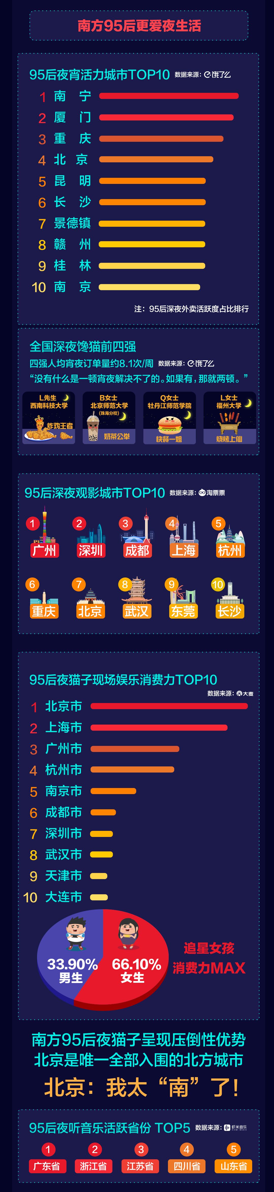 《95后夜猫子报告》综合数据显示,无论是观影、追星、听音乐,还是吃宵夜,南方95后夜猫子的活跃度都呈现压倒性优势。95后宵夜活力城市TOP10、95后深夜观影城市TOP10、95后夜猫子现场娱乐消费力TOP10榜单里,入围城市均以南方城市为主。