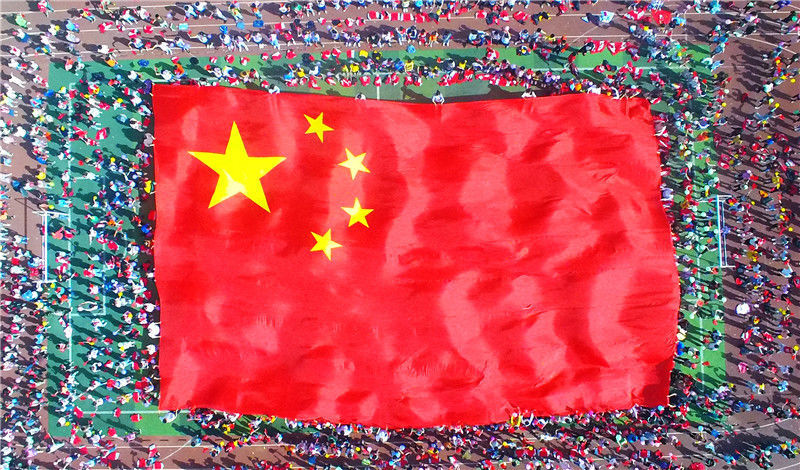 2019年9月20日,安徽省阜阳市颍东区正午镇中心小学的近800名小学生和老师围绕在长22.5米,宽15米的巨型五星红旗周围,大声喊出:“祖国祖国我爱您”。王彪/视觉中国编辑/陈进