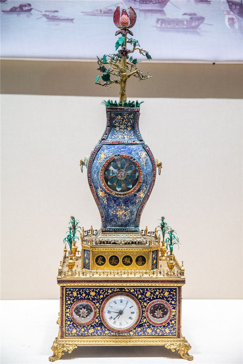 2019年9月20日晚,“匠心神巧——广作特展”在广州博物馆镇海楼隆重拉开帷幕。 铜镀金珐琅瓶变字转花开花钟,清乾隆,广州博物馆藏。