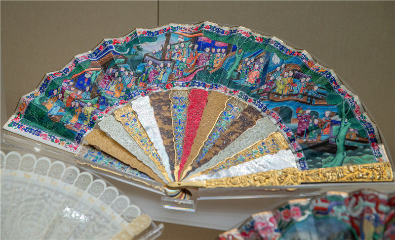 开幕仪式上,“广州织绣”非遗服装秀以20套反映广州织绣历史传承与创新突破的华服把开幕仪式推向了高潮。混合骨庭院人物图样板扇,清代,广州博物馆藏。