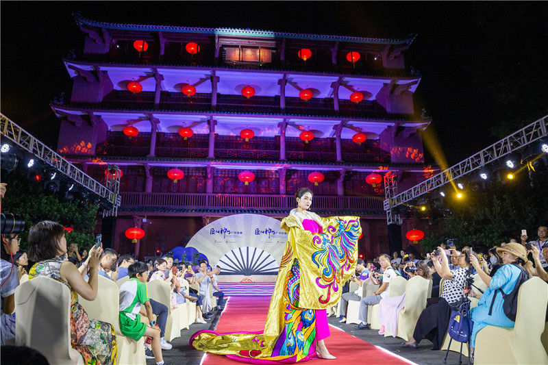 这也是镇海楼夜间开放以来的首次大show,把传统非遗与时尚元素有机结合,从缨络垂旒、蟒袍霞帔,到娟娟风雅的旗袍,及绮丽炫目的现代礼服,展现百年舞台服饰和织绣技术的演变。