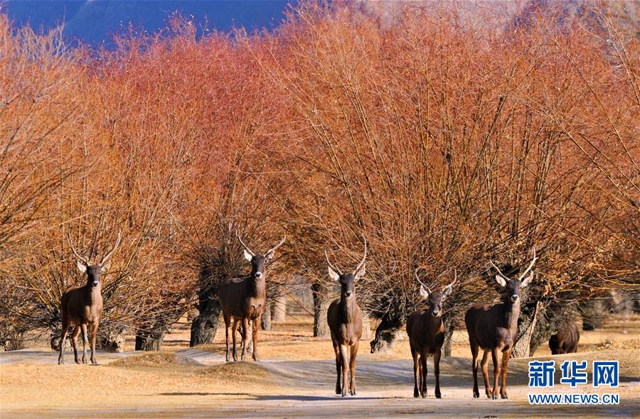 马鹿栖息在位于雅鲁藏布江岸边的山南市乃东区泽当镇的万亩人工防护林里(2018年1月6日摄)。新华社记者 张汝锋 摄