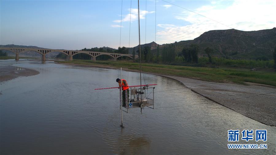 温家川水文站站长郑威在窟野河取沙(9月7日摄)。新华社记者刘诗平摄