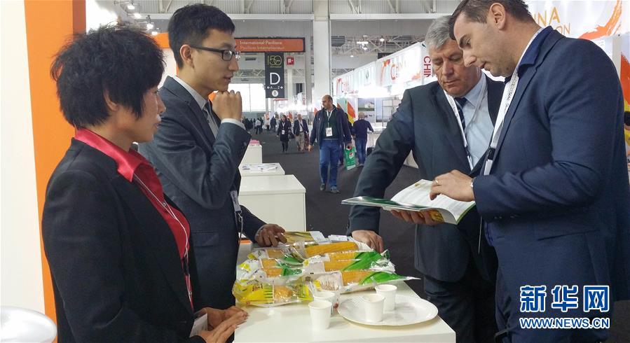 9月26日,隋书侠在产品展示区向记者展示出口的甜玉米产品。 新华社记者 王昊飞 摄