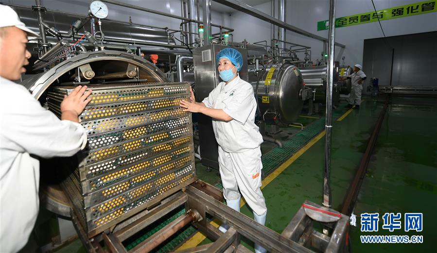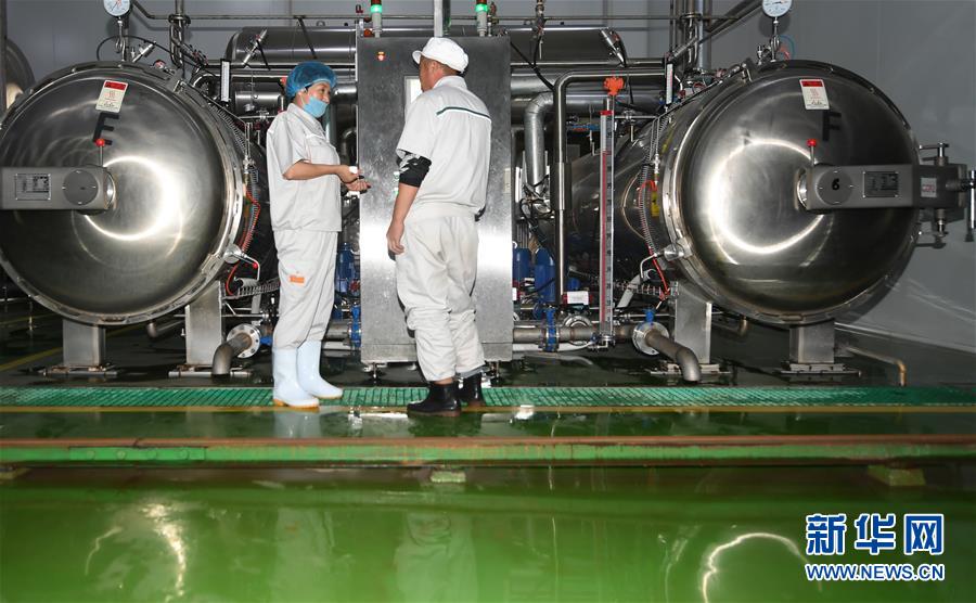 9月26日,隋书侠(左)在加工车间检查杀菌锅作业情况。 新华社记者 王昊飞 摄
