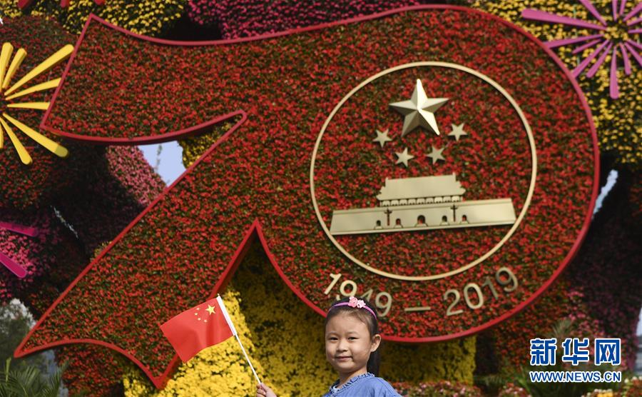 9月28日,一名小女孩在北京建国门西北角的“壮丽70年”主题花坛前留影。